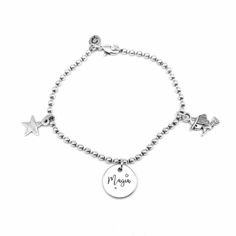 Pulsera personalizada de bolitas extrafinas de zamak y plata con tres abalorios muy monos una estrellita, una brujita en su escoba y en el medio una medallita pequeña con la grabación de » Magia».