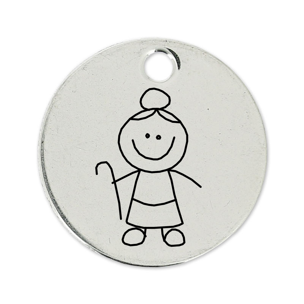 Medalla redonda de 22 mm bañada en plata. Personalizada a una cara con dibujos de la familia y posibilidad de grabar el nombre por detrás.