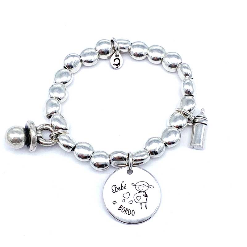Pulsera elástica de pepitas de zamak bañadas en plata. Incluye medalla grabada por una cara de tamaño grande, un abalorio de chupete y un biberón.