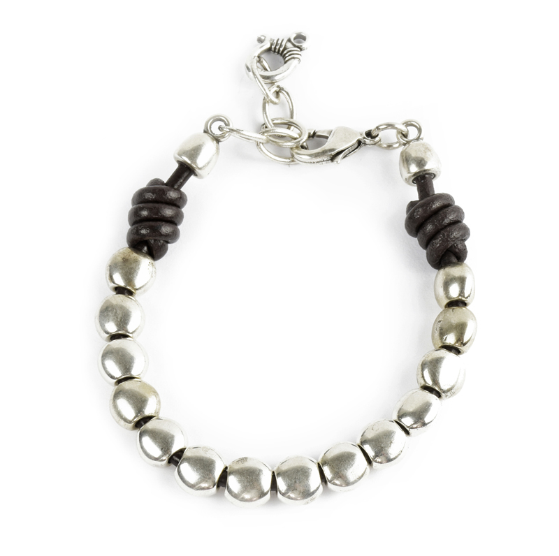 Pulsera montada de forma artesanal sobre cuero español de 2,5 mm marrón, con piezas irregulares con un baño de plata de 5 micras. Tamaño regulable con la cadena extensora de cierre y mosquetón.