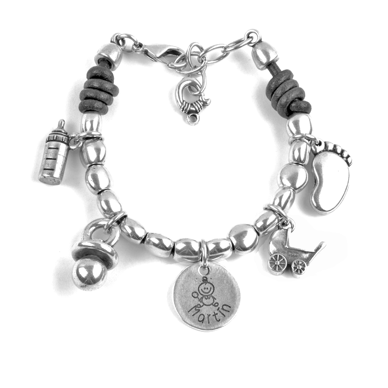 Con Biberón, Chupete, Pié, y Carrito, todo lo que rodea al bebé en sus primeros meses de vida. La medalla es de 15 mm y se pueden grabar ambas caras. El grabado de una cara está incluido en el precio.