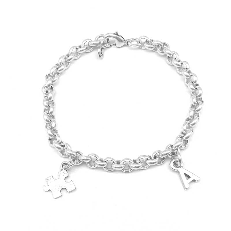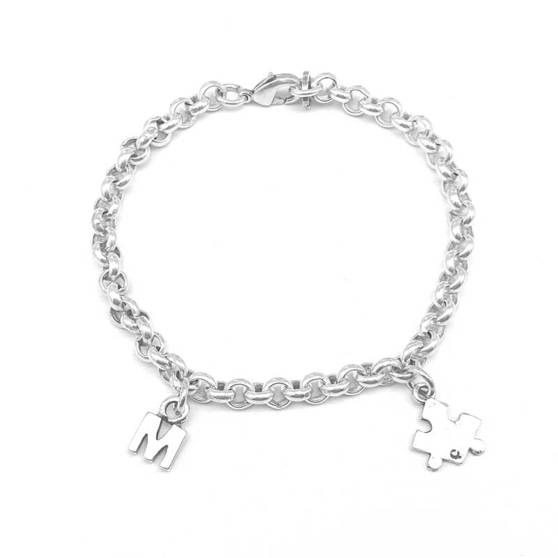 Pulsera personalizada de eslabones redondos perfecta para combinar con diferentes abalorios, cuenta con una inicial y una pieza de puzle. Simple y sencilla.