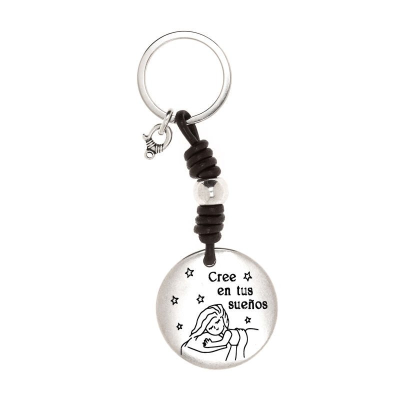 Llavero con medalla redonda de 40mm bañada en plata montado en cuero nacional de 2 5mm de color marron con una pieza de Zamak entre nudos. Con posibilidad de grabar la otra cara.