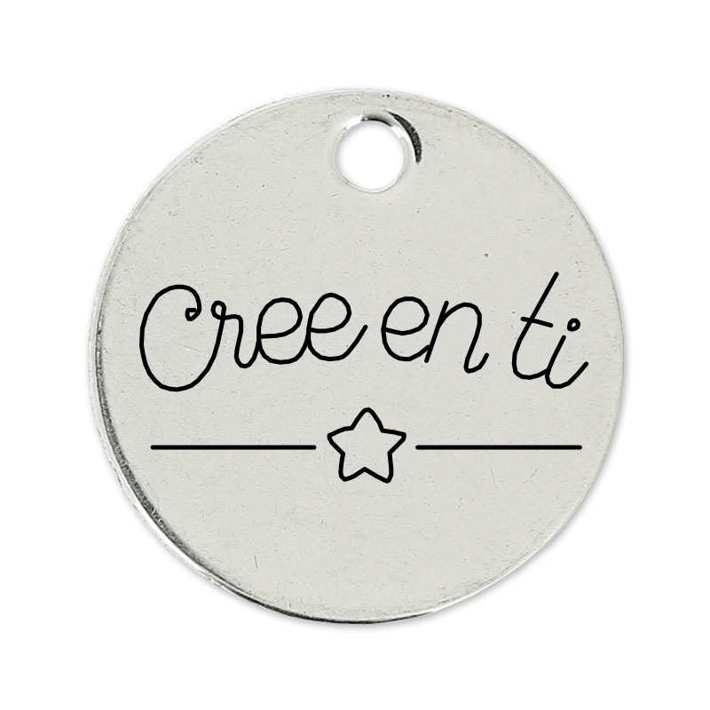 Medalla redonda de 22 mm de Zamak con un baño de plata de 5 micras. Una cara está personalizada con una de nuestras frases y tienes la posibilidad de grabar tu propio mensaje en la otra cara de la medalla.