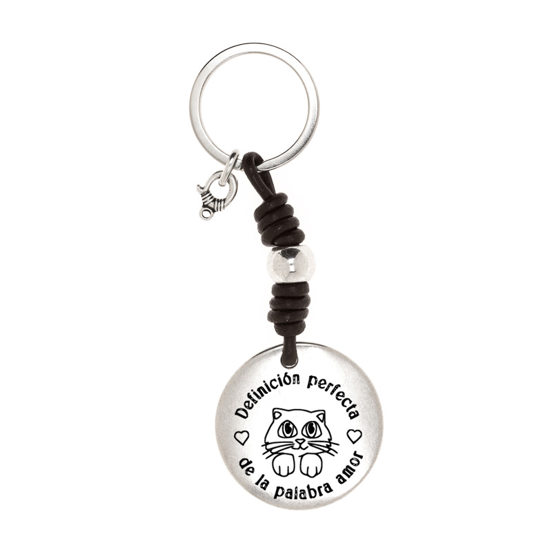 Llavero con medalla redonda de 40mm bañada en plata, montado en cuero nacional de 2,5mm de color marron, con una pieza de Zamak entre nudos. Con posibilidad de grabar la otra cara.