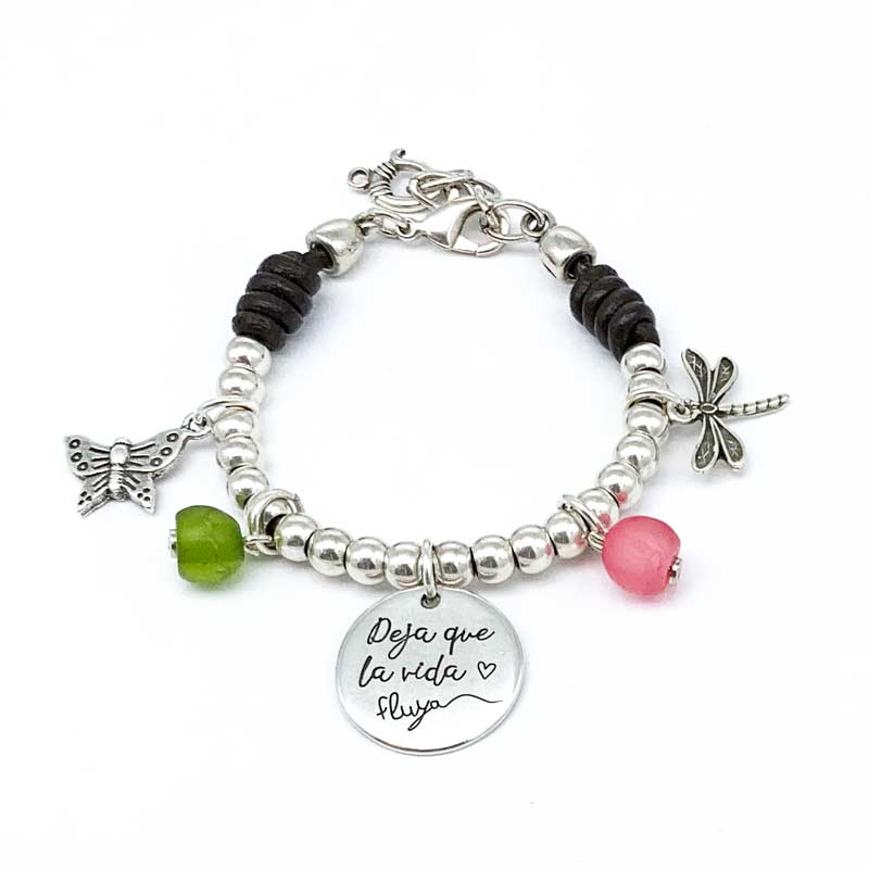Pulsera de cuero y bolas con los abalorios libélula, mariposa y dos bolas de hielo rosa y verde. Con una medalla personalizada con la frase «Deja que la vida fluya». Puedes grabar la otra cara de la medalla