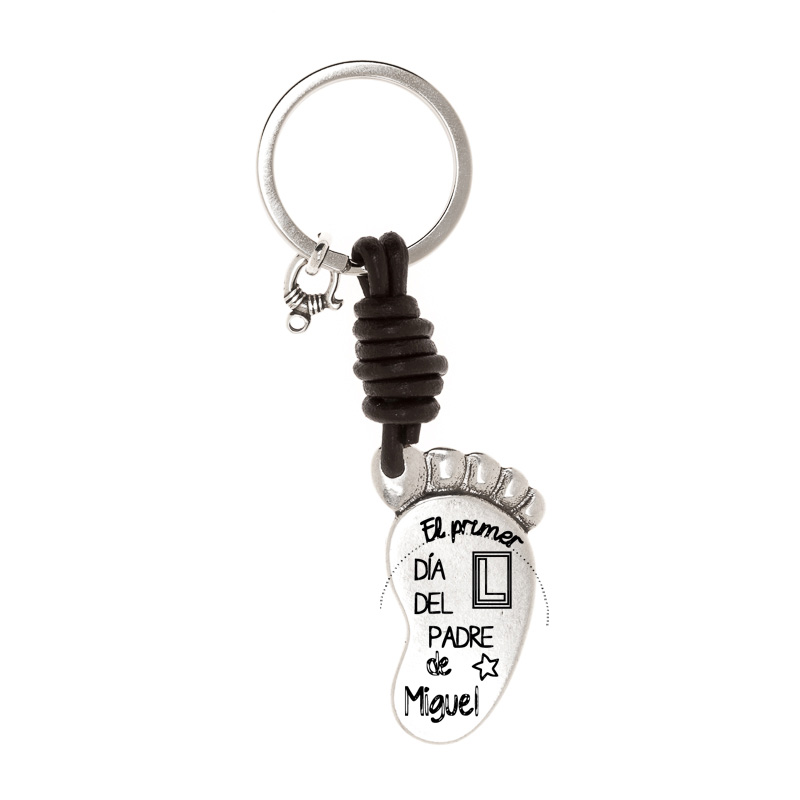 Llavero con forma de Pie, con un baño de plata de 5 micras, montado con cuero nacional de 2 5mm en color marron. Con posibilidad de grabar la otra cara
