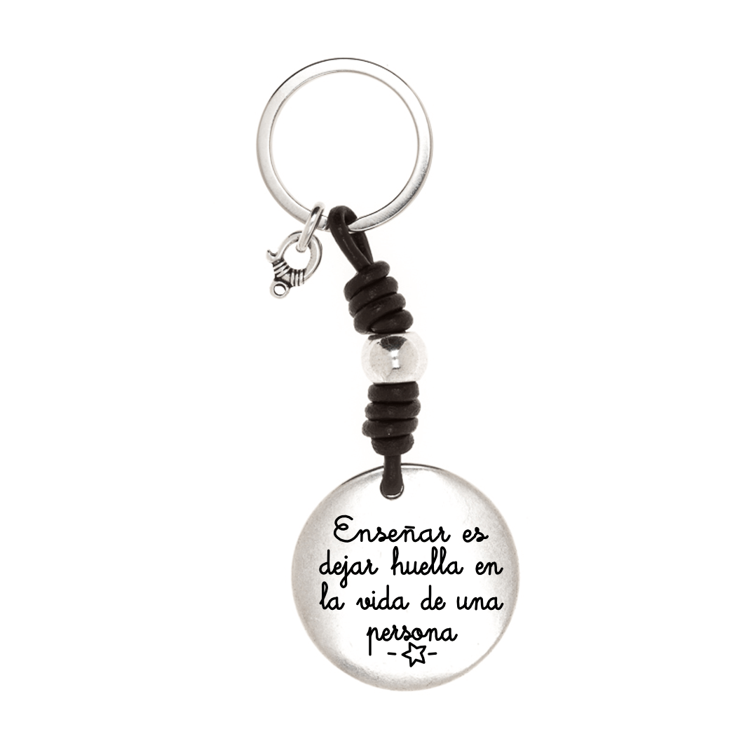 Un llavero perfecto para la persona que más sabe. ‘Enseñar es dejar huella en la vida de una persona’ Personaliza este llavero por detras y desmuestrale a tu profe todo tu cariño. Elaborado con cuerron marrón y una medalla de Zamak y bañada en 5 micras de aguja este lavero es fantastico para regalar a es apersona que nos lo enseña todo. ¡Tu profe!