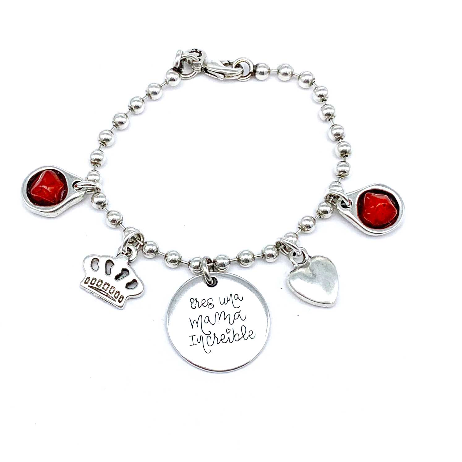 Pulsera de cadena de bolitas de zamak con baño de plata. Incluye medalla grande grabada por una cara, dos abalorios de piedra de resina roja, un abalorio de corona y corazón.