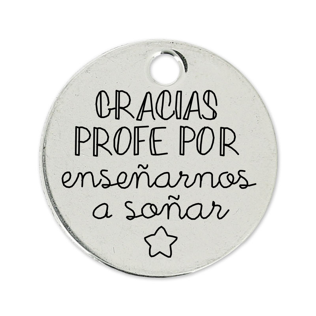 Medalla grande de 22mm elaborada con Zamak y bañada en 5 micras con la frase Gracias profe por enseñarme a soñar ’