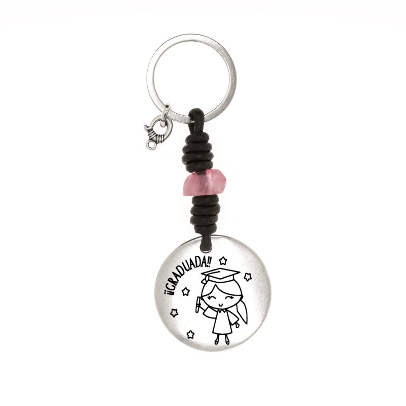 Llavero con la palabra GRADUADA grabada junto al dibujo de una chica con birrete de graduación