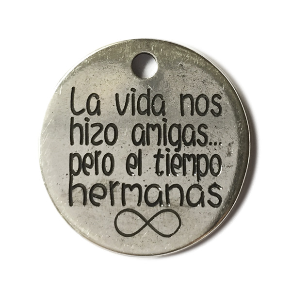 Medalla redonda de 22 mm bañada en plata. Personalizada a una cara con una frase y posibilidad de grabar el nombre por detrás.