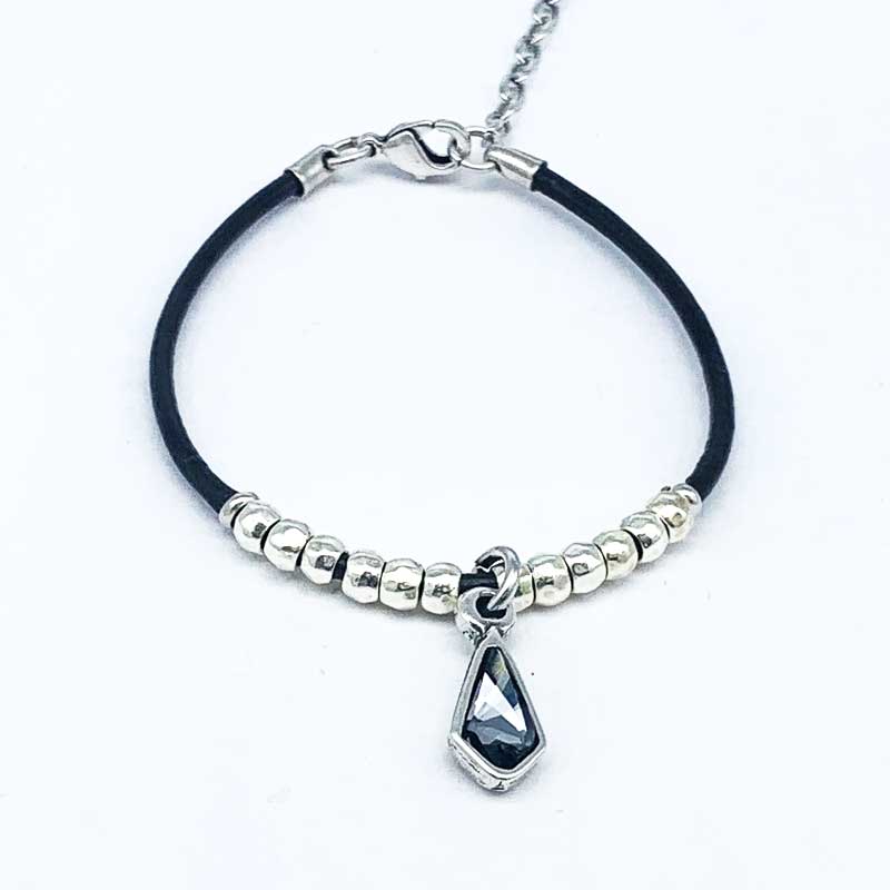 Pulsera Cuero fino con bolas + lágrima swarovski negra