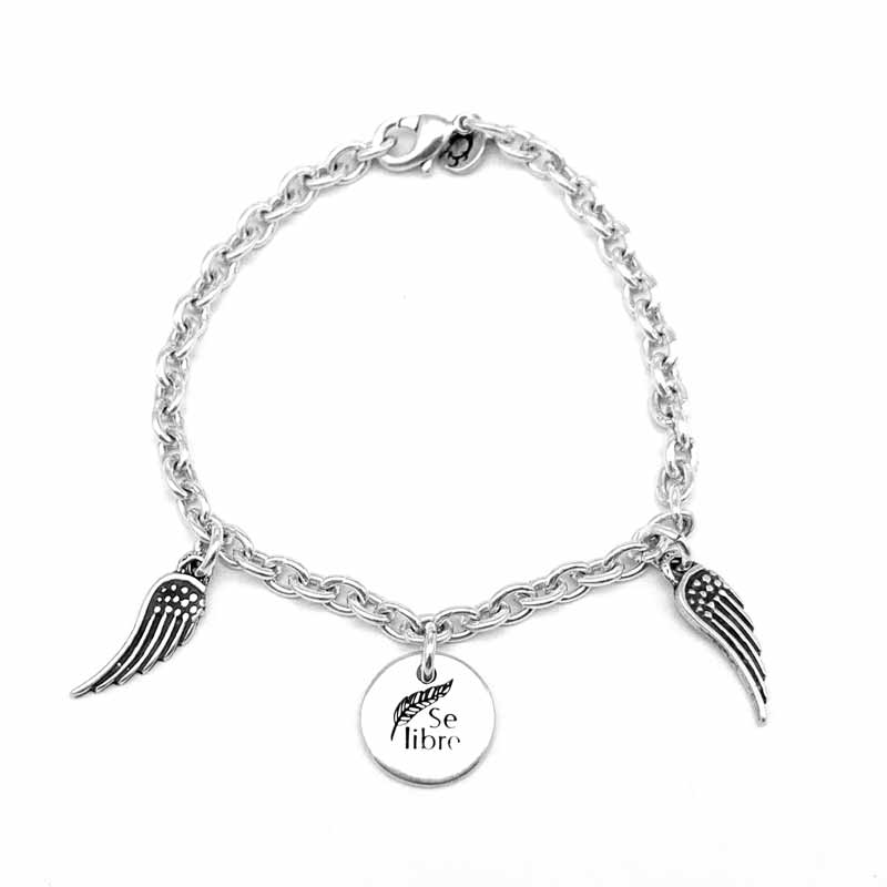 Pulsera personalizada de cadenilla con eslabón ovalado de zamak y plata con tres abalorios una medalla pequeñita con una grabación muy grande «se libre y una pluma» y con un ala a cada lado de la medallita.