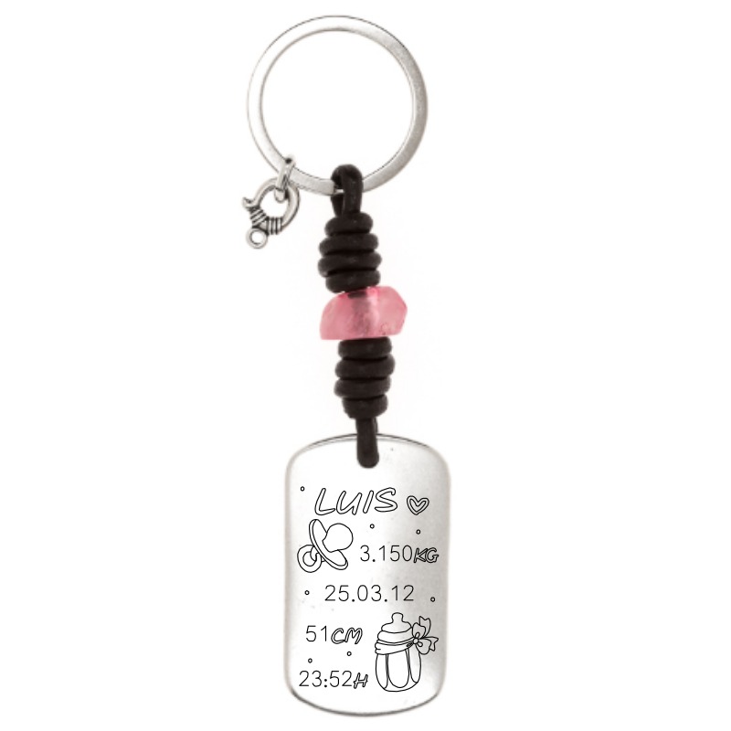 Sus dos nudos de cuero marrón junto con esta resina de color rosa engarzan este llavero para darle un toque color.