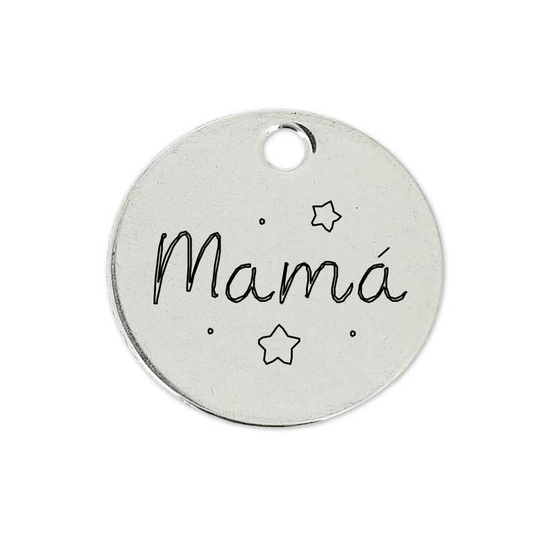 Medalla pequeña de 15mm elaborada con Zamak y bañada en 5 micras con la frase ‘mamá’
