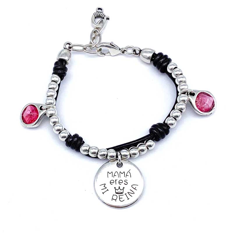 Pulsera de cuero marrón con nudos, bolitas de zamak bañadas en plata y cierre de mosqueton con cadena regulable. Incluye una medalla grande grabada por una cara y dos piedras de resina de color rosa.