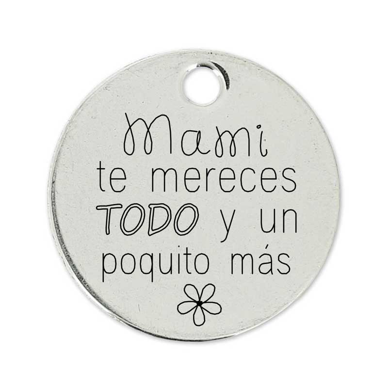 Medalla grande de 22mm elaborada con Zamak y bañada en 5 micras con la frase ‘ Mami, te lo mereces todo y un poquito más’