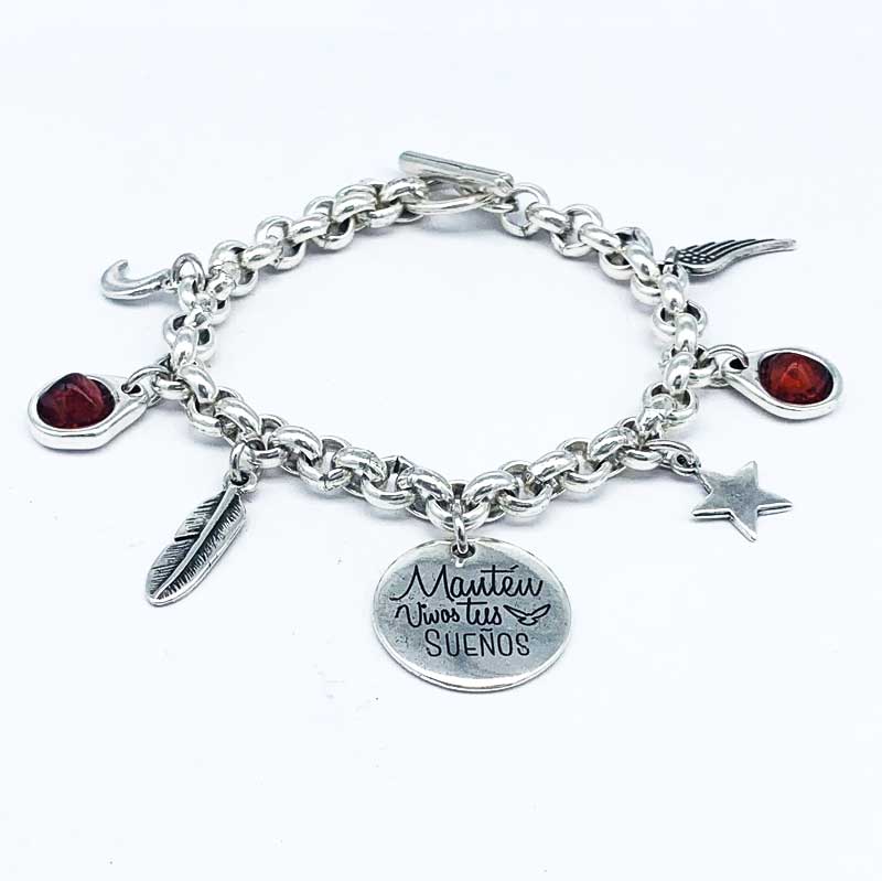 Pulsera Encadenada + abalorios + piedras rojas resina + med. Grande