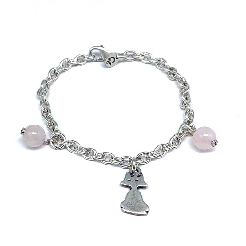 Pulsera Dana de eslabones ovalados y plateados elaborados con Zamak y bañados en 5 micras de plata formada con los abalorios silueta del gato y piedras de cuarzo rosa en forma redonda y cierre de msoqueton
