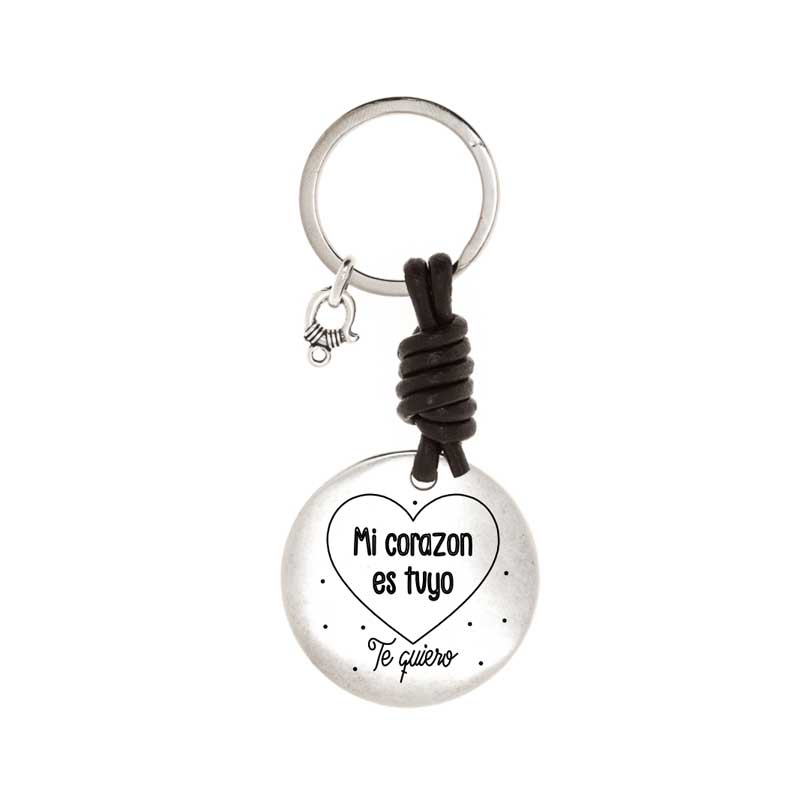 Una medalla redonda de 40mm de diámetro con la frase ‘Mi Corazón es Tuyo’ grabado dentro de un corazón y «Te Quiero» grabado debajo. La medalla es de Zamak y está bañada en 5 micras de plata.