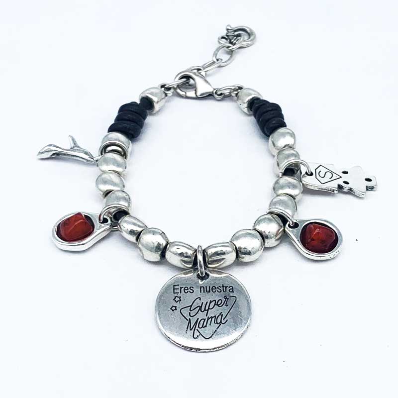 Pulsera Mamá 24- Cuero y pepitas + piedras de resina + abalorios + med. Grande