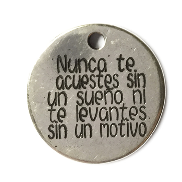 Medalla redonda de 22 mm bañada en plata. Personalizada a una cara con una frase y posibilidad de grabar el nombre por detrás.