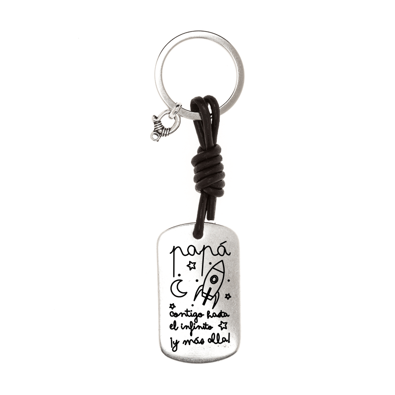 Su cordón de cuero marrón une esta medalla a una anilla en forma de espiral para sea perfectamente adaptable a tu juego de llaves.