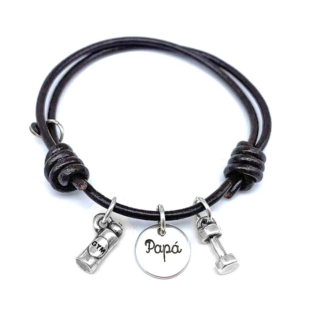 Pulsera de cuero marrón con 2 nudos corredizos . Medalla de 15mm con el grabado ‘Papá’ y acompañado por los abalorios de pesa y botella del gym. Elaborado con Zamak y bañado en 5 micras de plata.