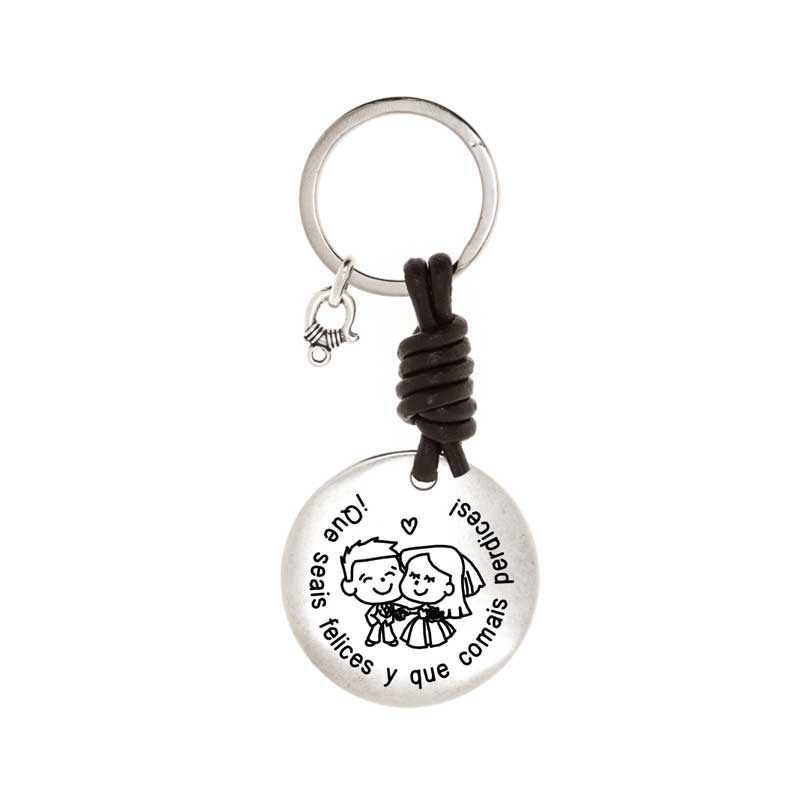Llavero personalizado para regalar en el día de su boda como agradecimiento con la frase «Que seáis felices y comáis perdices» decorado con una pareja de casados. Regalo ideal para los novios.