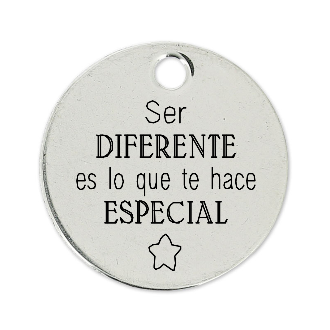 Medalla redonda de 22 mm de Zamak con un baño de plata de 5 micras. Una cara está personalizada con una de nuestras frases y tienes la posibilidad de grabar tu propio mensaje en la otra cara de la medalla.