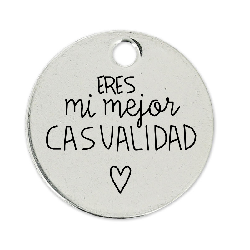 Medalla redonda de 22 mm de Zamak con un baño de plata de 5 micras. Una cara está personalizada con una de nuestras frases y tienes la posibilidad de grabar tu propio mensaje en la otra cara de la medalla.