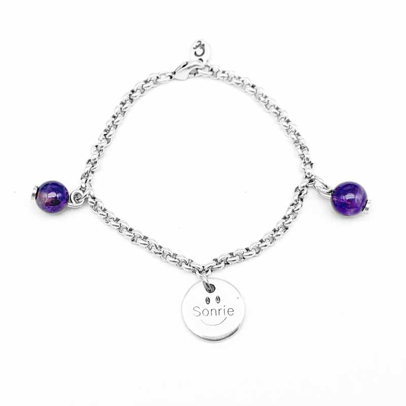 Pulsera personalizada de eslabones redonditos extrafina con una medallita pequeña con la grabación de «Sonrie» y dos abalorios de piedra natural amatista moradas.
