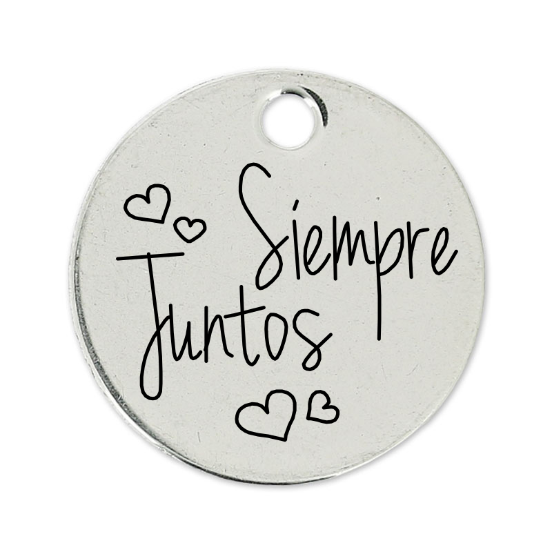 Medalla redonda de 22 mm de Zamak con un baño de plata de 5 micras. Una cara está personalizada con una de nuestras frases y tienes la posibilidad de grabar tu propio mensaje en la otra cara de la medalla.