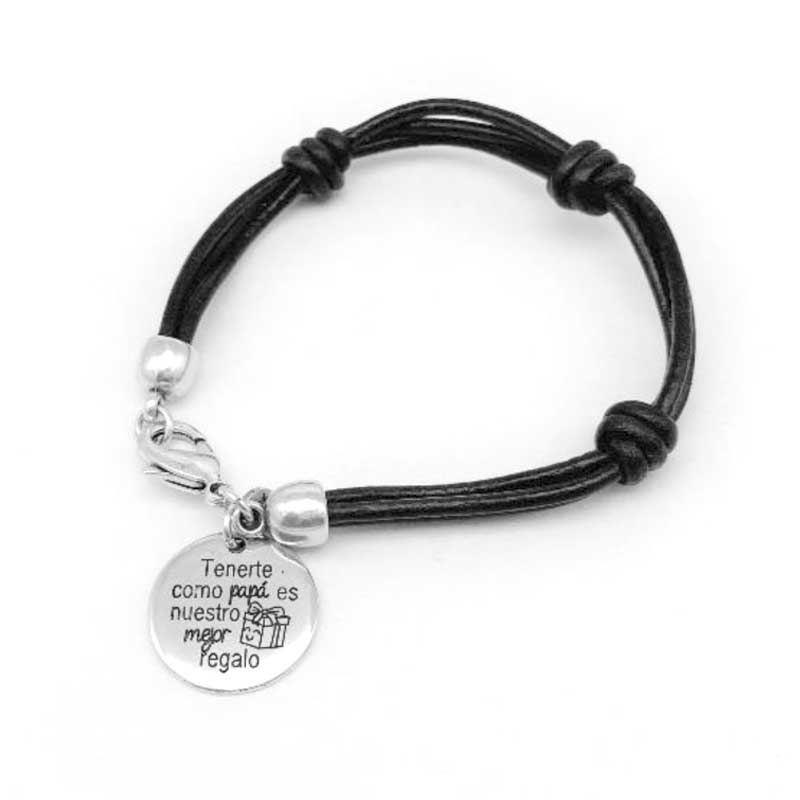 Pulsera de cuero para regalarle a Papá en su Día: La Medalla lleva grabada la frase “Tenerte como papá es nuestro mejor regalo”. Con el dibujo de una cajita de regalo.