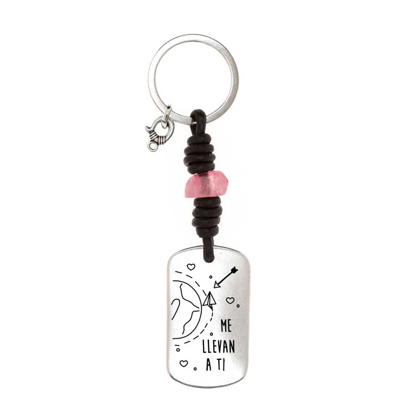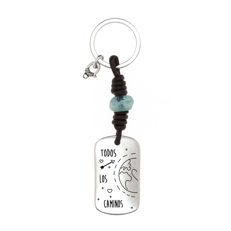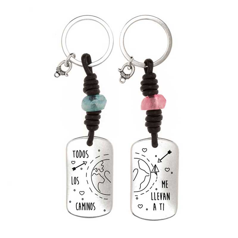 Dos Llaveros Personalizados, con medalla militar de 45mmx25mm bañada en plata montado con cuero nacional de 2 5mm en color marron. Entre los nudos hay una pieza irregular de resina color rosa en uno de los llaveros y azul en el otro. Con posibilidad de grabar la otra cara de cada llavero