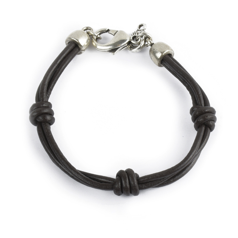 Pulsera hecha a mano con tres cordones de cuero español de color marrón, tres nudos y cierre de mosquetón.